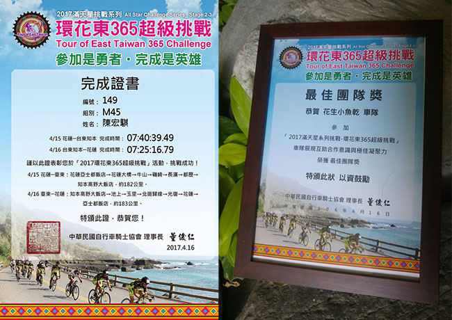 這樣就把環花東365公里騎完了,中間經過的美景都沒有機會下來仔細品嘗,我在單車上就想著下次開車來再來回味,這次就算是探路吧… 至於明年是否再來一次?打死我都不要… 哈哈哈。今年我們可是與花生小魚乾隊友共同得到「最佳團隊獎」,大會特地表揚我們各自散開、距離10公里的幫隊友破風,然後想著要如何甩掉對方揚長而去的合作精神,這樣的赤裸裸互相扶持的友情,值得明年再找個挑戰聚會一次,夥伴們~ 明年見 (要讓你看不到我的車尾燈!)