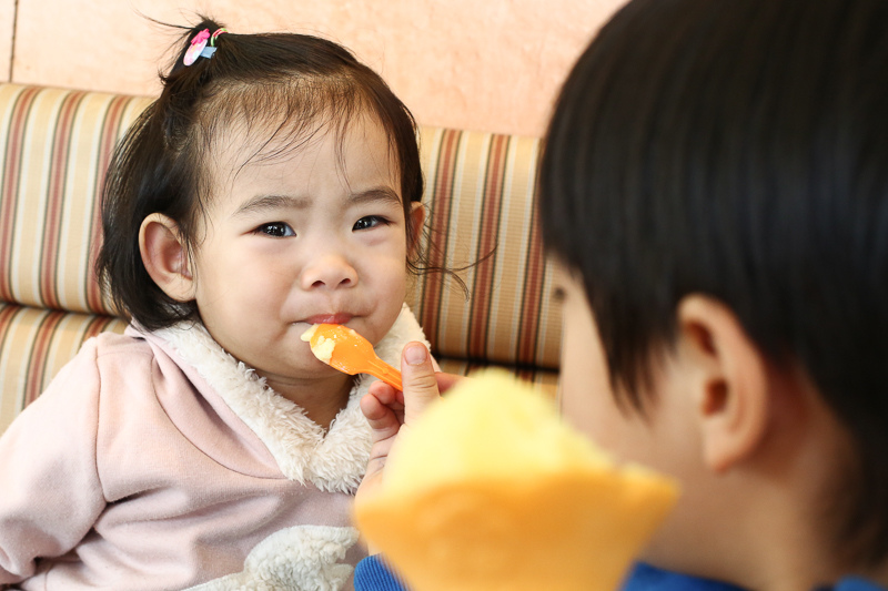 彤妹對於鳳梨冰淇淋的口味沒有很捧場,看表情就知道...