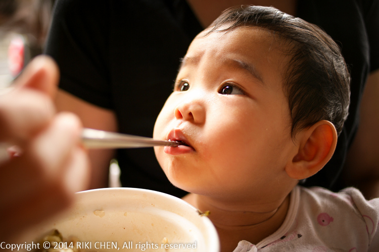 妹妹看我們吃也是口水直流,來吃幾顆米讓你過過癮