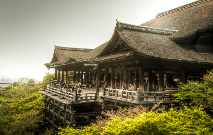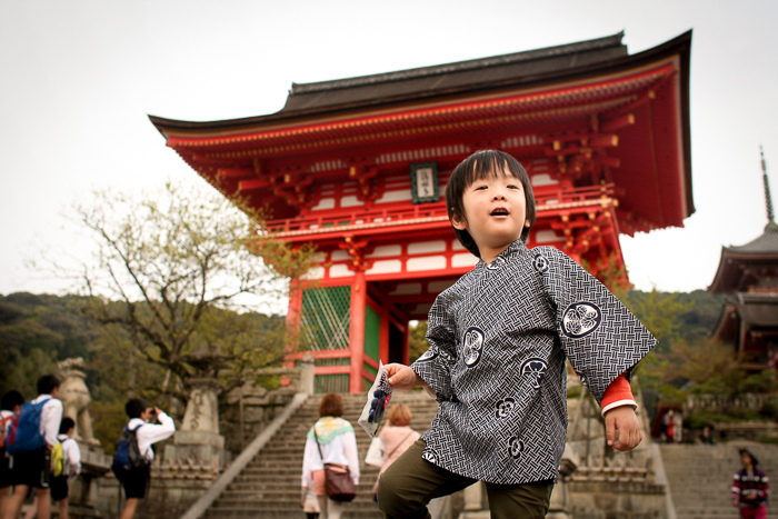 照片中的清水寺聳立在崖邊,跟鋼鐵人第三集被炸爛的豪宅一樣,只能用個屌(awesome)字來形容。既然是間山頂大廟,那就表示信徒們要從山下爬上去,兒子走累也要抱... 但為了清水寺,咬牙也要撐住!