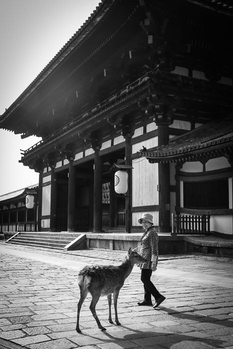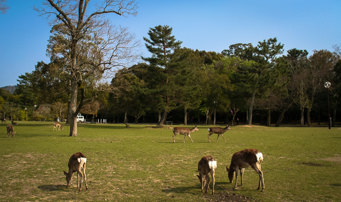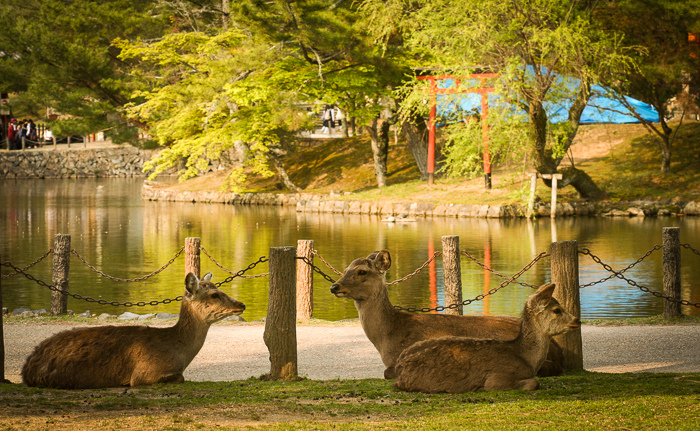 結果跟我想的完全不一樣啊!! 奈良根本就是被鹿佔領了,所有的公園幾乎都有他們的蹤跡,甚至連世界遺產東大寺也不能倖免。這些鹿對於人類只有兩種分類,(A)有帶食物 (B)沒帶食物,對A類型的人類就是群起圍攻,直到食物被吃光,變回B類型... 攻擊的行為包含(1)用頭頂 (2)直接咬下去,跟流氓打劫沒啥差別,不信的人可以花日幣150買些鹿餅乾試試看,就會打破迪士尼長久以來洗腦的小鹿斑比印象。