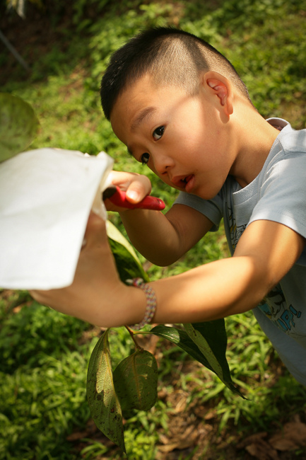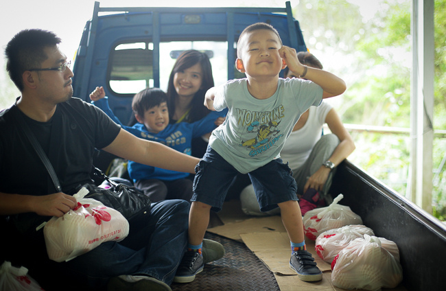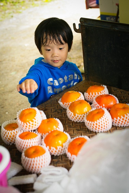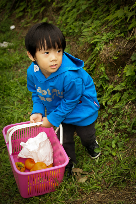 千里迢迢來到尖石鄉,如果只採幾顆回去,那C/P值就太低了,而且流有自耕農基因的兒子,對於這種農家生活似乎頗愛,那就請盡量吧... 照例媽媽帶著小孩努力採水果,兩個男人在旁邊聊單車打嘴砲,標準員外style的生活模式,很快的就摘滿一整簍了。邱爸爸切了一顆甜柿給大家吃,老婆品嘗後驚為天人的大喊「好甜喔...」,秤完重邱爸爸說出價格後,產地直銷的價格實在太誘人了,摘這麼一點回去實在對不起這140公里的油錢,恩... 繼續回去給我用力採!