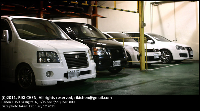 一台白色的SOLIO也熄火停好車,不偏不倚就被安排到黑色的SOLIO旁邊... 走兩步看到停車架上,又是兩部一樣的FORD FOCUS成雙對!嗯... 這家停車場的管理員真會找樂子,很有耐心地玩這種汽車對對碰,可說是「樂在工作」的最佳代言人。
