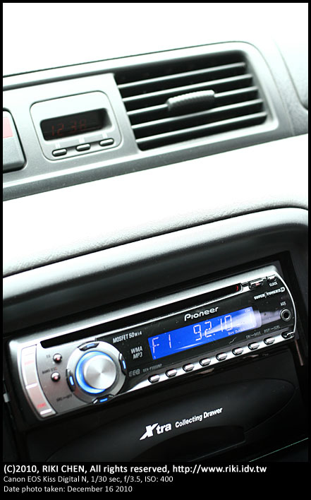塑膠感十足的內裝; 原廠音響掛掉後換上的Pioneer,聽我最愛的電台...