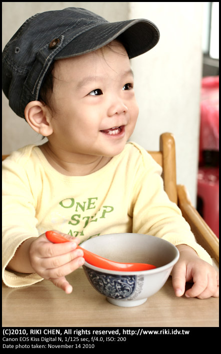 橘董已經開始學著自己吃東西了喔~ (這樣爸媽才有空閒吃飯)