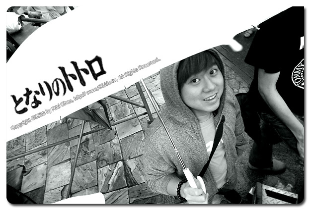 下著雨的星期天星光三少簽唱會,我在台上照顧著歌迷的安全,也順手拍幾張照片... 正當我往台下看去時,拿著傘的King哥扮相超級Q,總覺得似曾相識,直覺就按下快門了... 過一陣子看照片突然想到,這不是懷念許久的宮崎駿大師作品「龍貓 Totoro」嗎? 維基百科對龍貓的說明是:《龍貓 My Neighbor Totoro》是吉卜力工作室與德間書店於1988年推出的一部動畫電影。描寫的是日本在經濟高度發展前存在的美麗自然,那個只有孩子才能看見的不可思議世界和豐富的想像,因為喚起觀眾的鄉愁而廣受大眾歡迎。1988年4月16日在日本公映,大約有80萬人入電影院觀看。 管他百科全書上說甚麼?我只記得這部片子在我大學時候風靡全台,萬年百貨裡的小商店都是擺滿了龍貓相關物品,而我當時購買的那片龍貓錄影帶,被我年幼的表弟再三的觀賞後終於掉磁陣亡,而他現在已經是個大學生了。 時間過得真快,但龍貓的印象卻永遠揮之不去,這是最溫馨的影像記憶,也感謝King哥讓我回想起大師的創造!