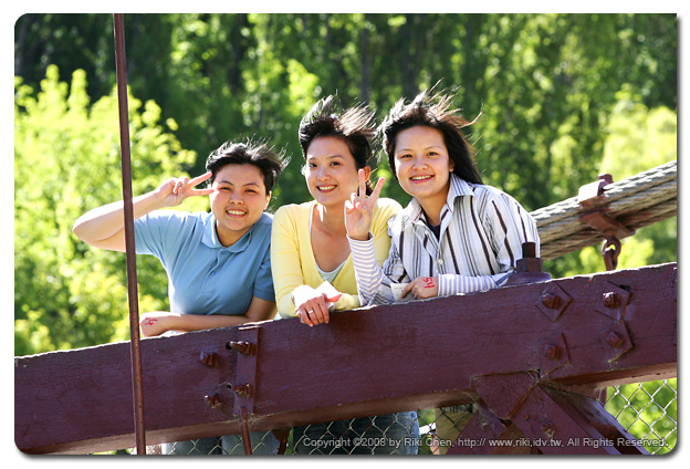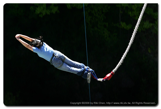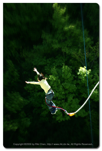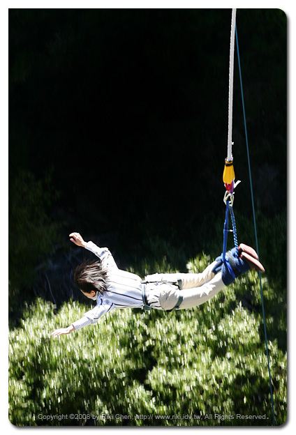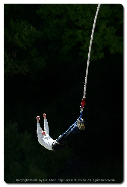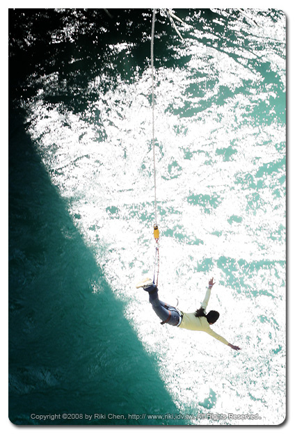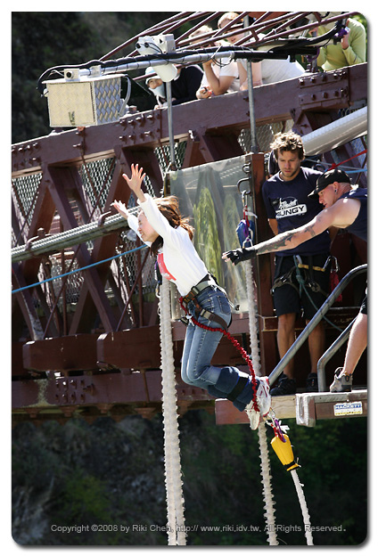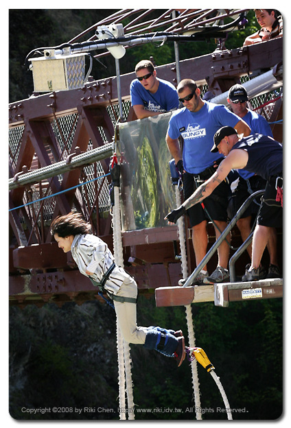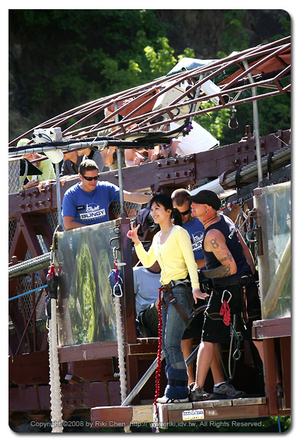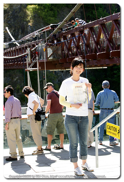 給各位猜個謎,請問哪種男人會把老婆推下溪谷?答案是... 到紐西蘭蜜月的男人! 我們紐西蘭的旅程漸入佳境,來到皇后鎮高空彈跳的發源地Kawarau Bridge,不知道怎麼會發瘋跟毛利人學這玩意,腳上綁著繩子然後從橋上往下跳,實在是太瘋狂太刺激了,我這種安居樂業、與世無爭的一等良民,血液中絕對沒有這種冒險因子,死也不肯幹這種蠢事。我不會是孤獨的,整車的男人90%都拒絕了這項瘋狂的嘗試,只有太太們舉手報名,再度證明女人實在是一種容易衝動的生物,跟以理智為中心的男人是來自不同星球的動物。 全車五對夫妻檔只有一組兩人報名,其他的男人們都藉著照顧行李來逃避,這些瘋狂的太太們就這樣無所懼的爆了名,量了體重繳了錢就準備上場表演了。結果不用多說...,只要一上跳台沒有人不軟腳,接著就是陣陣尖叫聲中完成了高空彈跳的挑戰。 不過千萬不要對這項遊戲的安全性產生懷疑,現場展示了綁在腳上的繩索的秘密,並不是我門想像的一條麻繩,而是一大綑類似橡皮筋的彈性物質,集結數百條組合而成的;而且事先測量每位體重,然後決定繩索的長度,整個感覺非常科學,值得大家放心嘗試。﹝其實就算繩子斷了也只會掉落水中,河面上有專人划著橡皮艇,安啦﹞ 大老遠來到紐西蘭這個世界上第一個高空彈跳的發源地,怎麼可以不嘗試一下呢?除非你跟我一樣肩負著幫全團拍照的任務,不然一個大男人不上去跳一下,會被老外瞧不起說我們是娘砲喔! |