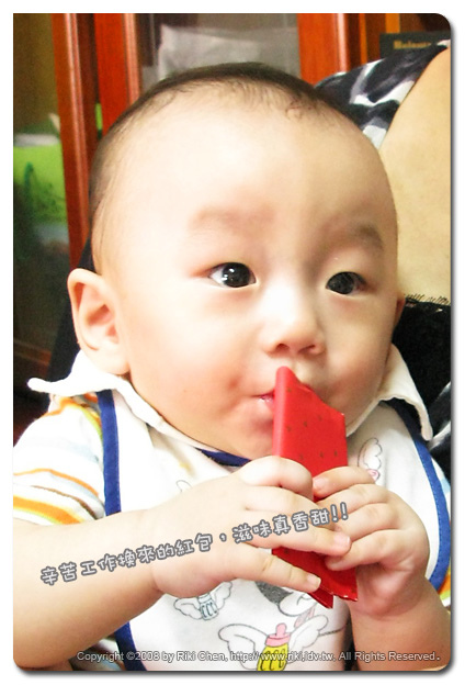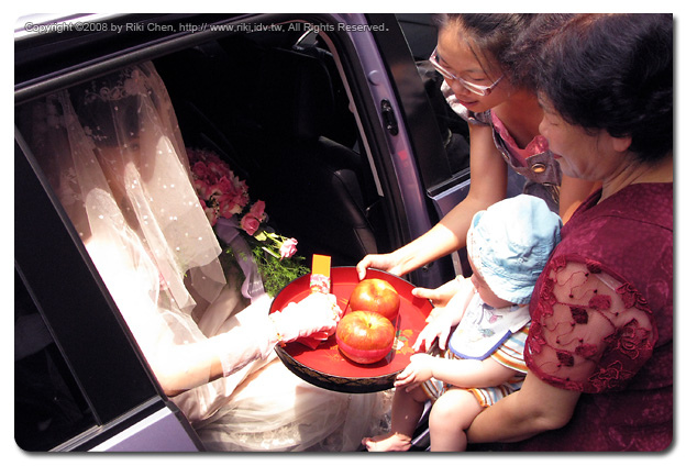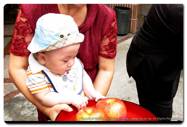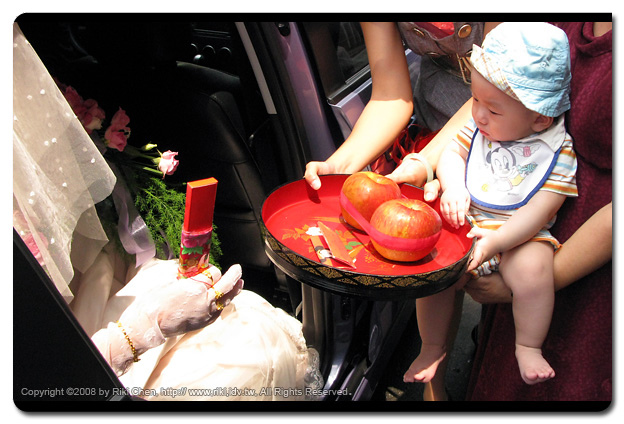 我可愛的外甥 - 小貢丸開始賺紅包錢囉,他的表哥金太郎包辦我家兄妹婚禮,舉凡迎娶拜轎、跳床、花童... 反正能拿紅包的場合一個都不放過。據說目前金太郎存款數字已經超越他爸爸,真是英雄出少年、搶錢不手軟!可憐的小貢丸出生太晚,我們家的婚禮已經告一段落,已經沒有婚禮花童的市場了,只好從開闢新市場下手,正好他叔叔準備娶媳婦,七個月的他接到了人生第一筆婚禮外快,值得好好紀念一下。 什麼是「拜轎」呢?在迎娶新娘回到新郎家後,男方由一男童,雙手捧紅漆喜盤,內放兩個大蜜柑(橘)或蘋果,用紅紙圈起,來到新娘禮車前,開車門恭請新娘下車,俗稱拜轎,新娘應用手撫摸蜜柑,並將蜜柑位置對調,然後放一個紅包壓在蜜柑下,男童退。 看到沒有?這樣優良的傳統禮節重點在於那個紅包!!! 不是啦,是象徵甜甜蜜蜜(蜜柑)或平平安安(蘋果),這項神聖的工作當然要由小貢丸來完成,七個月的他很認真的捧著拖盤,迎接嬸嬸加入新家庭,很襯職完成任務的他,當然值得一個大紅包獎賞囉!至於全程抱著小貢丸的媒人ㄚ嬤,謝謝您的辛苦... 紅包不會分給你喔 ^_^ 至於小貢丸的舅舅 ─ 也就是我,整個婚禮過程我只有拍小貢丸出場這一段,哈哈哈!! |