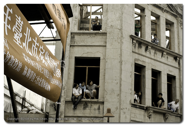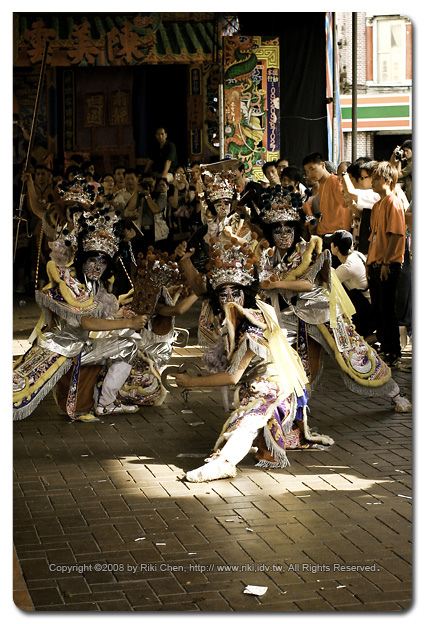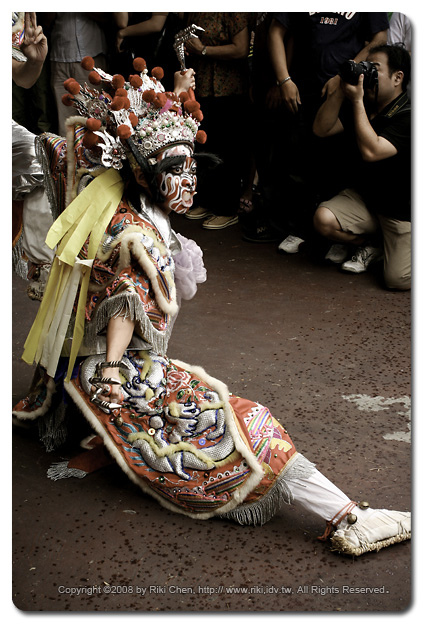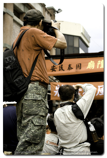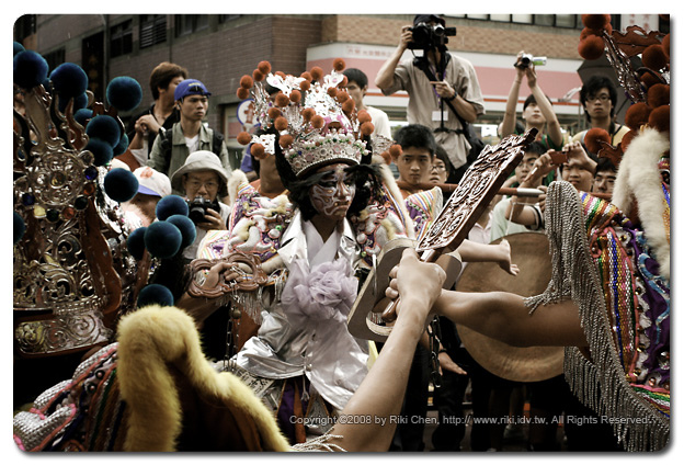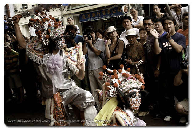 請問大家,只有帶一顆定焦鏡35mm F2,遇到值得紀錄的慶典活動該如何拍? 答案是... 【硬拍】囉! 下午來到城隍廟口,本來目的只是吃盤臭豆腐、來碗杏仁露當點心,沒想到遇到台北市立社會教育館主辦的「97年台北市家將匯演」活動,本著湊熱鬧不落人後的心態,拎著差不多該被淘汰的EOS 350D,就擠到人群中順手拍個幾張。這是隨身攜帶相機的好處,不會錯過任何一個值得紀錄的鏡頭。講到鏡頭... 我只有帶要拍小外甥的短鏡(35mm F2),在一堆拿著大砲的攝影同好中顯得非常突兀,除了往前擠之外沒有其他辦法,能拍多少算多少,硬著頭皮拍! 「臺北霞海城隍文化祭」是日治時期以來北臺灣最盛大的廟會祭典,除了有連續十五天精采的歌仔戲表演,6月15日(周日)下午1時更將於霞海城隍廟旁的迪化街永樂廣場展開『將舞神風-97年臺北市家將匯演』,除了特別邀請到臺灣家將起源的『臺南市白龍庵五靈堂駕前什家將』北上做示範演出外,還邀請『屏東縣東港鎮共善堂什家將』、『嘉邑巡天堂五府千歲駕前八家將』、『嘉邑慈濟宮駕前如意振裕堂八家將』、『嘉邑古桃城拱吉堂什家將』等中南部家將翹楚團隊共襄盛舉,並加入『桃園菓林太子宮官將首』以及『八彩善田樂舞藝坊』與『哪吒劇坊』呈現藝術觀摩的演出,讓整體活動更加豐富精采! 不過看了主辦單位的新聞稿,對於這項傳統民間藝術的變質感到無奈,雖然許多表演藝術團體挪用家將活動的元素,進而融合出創新的藝術結果,但是民間一般對家將表演,還是將這種看似威武且神秘的家將民俗活動,貼上犯罪淵藪的標籤,也因而使得傳統家將文化的藝術層面漸被忽略遺忘。因此主辦單位希望藉由這次活動,讓民眾對家將團能重新認識,除冀能鬆動並褪去社會的刻板負面印象外,也讓藝術創作者真正感受家將民俗藝術爆發性的肢體美感。...... 立意雖美,不過我想不可能一場活動就能改變刻板印象,想要將這項傳統民俗文化發揚光大,讓社會以藝術眼光來看待,而非與翹家幫派劃上等號,相關單位還有許多路要走,加油~ 好嗎? 現場有許多攝影同好記錄這次的活動,我很偷懶只有拍最後一個團體表演(殘念),而且開始飄雨我就澇跑吃杏仁露去了,對不起大家~ 這次的活動紀錄是意外的邂逅,玩票性質拍的幾張,有興趣的朋友可以上網搜尋更多相關資料喔。 【民俗藝術小辭典】 |