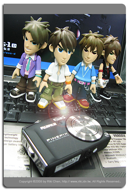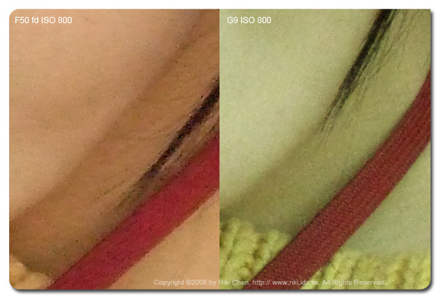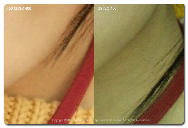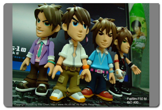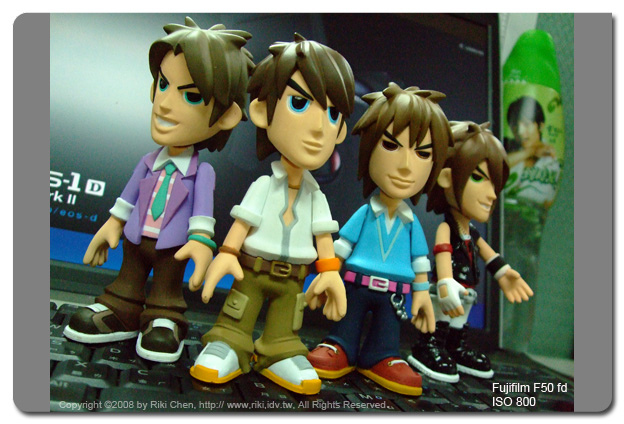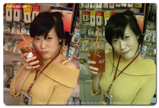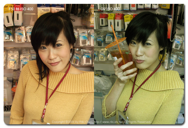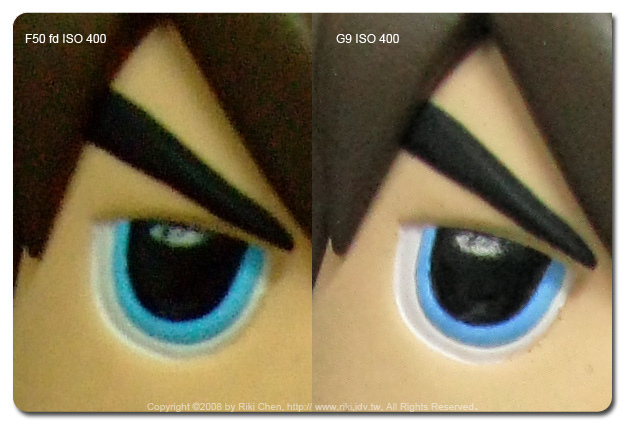 辦公室某位仁兄看到我上次寫的Fujifilm F50 fd的推薦文章後,立刻MSN上拜託我幫他買一台,因為我講得好像不買對不起台灣,「馬上!就買囉」。他老兄都這樣說了,也因為他出差不在台北,所以我只好跑一趟億華幫大爺跑腿囉。 拿到這台相機當然要好好來測試一下(反正他老兄暫時還拿不到),主要是對他的高ISO表現很好奇,以及聽說正片模式的顏色超級豔麗,剛好隨身帶著G9,那就兩台比一比~ 看售價只有G9一半的F50 fd表現如何,如果G9被PK掉了... 那一堆被我「屎弄(台語)」買G9的苦主一定會殺了我...。 在億華現場用標準模式(相機不作色彩調整)以ISO 400 與 800拍了店長照片,另外用兩台相機的正片模式拍了公仔兩種ISO值照片,那就直接進電腦看結果吧! ﹝人像測試結果﹞ 兩台相機當然各有不同的設計理念,隨身機F50 fd的照片當然較為討喜,相對的G9為了保留後製空間,顏色呈現上就保守許多。在ISO 400的人像表現上F50的確比較討喜,陰影部份的雜訊抑制很強,但感覺會犧牲圖像上的一些細節。這狀況在ISO 800時候更明顯,沒有討人厭的髒污砸訊,但是細節通通不見了~ 注意看億華妹的名牌帶,什麼材質都不知道囉,比較起來G9在細節表現上就好很多。但是... 只要將縮圖至網路相簿常用的大小,誰還管那種小細節,這時候傾全力除雜訊的F50當然以討喜的表現勝出。 |