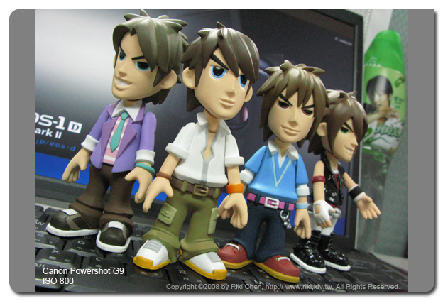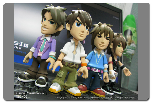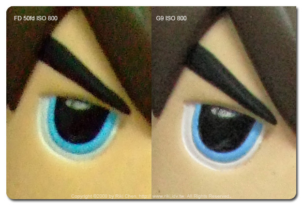 ﹝正片模式測試結果﹞ 再來玩玩兩台相機的正片模式,看習慣Canon清淡口味的觀眾可能會被Fujifilm的大膽嚇死,我都已經調到顏色較濃的正片模式了,兩者比較之下還是差很多,簡直就是味增跟味素的差別了!又回到給主流大眾使用的網路相簿設計概念,縮圖來看Fujiflim真的很好看,顏色飽和、高對比立體感十足,但是細節在這種情況下就必須犧牲了,看公仔的眉毛就知道了,Fujifilm看起來是單純的大濃眉,G9還可以看得到整個眉毛的設計幅度(如果你在乎這些的話)。 既然大家都說Canon是留給後製空間,那我們把ISO 400的照片進PS調整看看,兩個步驟就可以達成F50的這種Tone調,要多濃就可以多濃啦,這就叫做「逆轉勝!」~ (懂了嗎?) ﹝結論﹞ 原先以為Fujifilm的superCCD的雜訊抑制會把G9打的潰不成軍,但是G9應該還是佔有感光原件較大的優勢,雜訊表現上並不會輸太多,而且細節都有保留住。但現今使用者是否喜歡Canon的這種作法就不得而知了,大家都是用縮圖比照片,如果以原圖直接上戰場,在喜歡重口味的大眾市場中,那Canon的表現勢必不如Fujifilm,這也是一種無奈的非戰之罪啊。 如果你看得懂這篇再寫什麼?那還是買G9比較保險,如果只看得懂圖片,相信F50 fd是最好的選擇! |