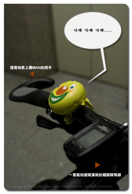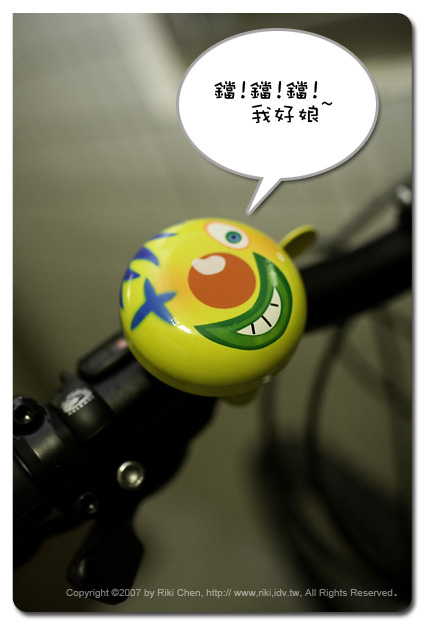 同事徐咪女士到法國度假充電一個星期,每天大概覺得耳朵癢癢~ 辦公室每天都是充滿業務繁忙的哀嚎,狂叫幾聲後一定會罵罵在國外消遙的徐咪... 總算撐到結束bonjour的日子,恢復正常上班的徐咪照例帶來法蘭斯的伴手禮,一看就知道有用心找過的貼心禮物,為了我的行車安全特別買的自行車鈴鐺(應該為了行人安全吧),超感動! 但總覺得有點怪怪的... 有種說不出來的粉紅色氣息瞬時飄放在空間中~ 我的愛車可是超MAN的登山車,這鈴噹似乎太可愛了... 總覺得是純愛MV中的道具,或是裝菜籃的淑女車的裝備,跟男子氣概百分百的登山車不太搭耶~ 「謝謝徐咪~ 請問我一定要裝嗎?」 「當然啊!! 講這甚麼屁話,你禮物都收了~ 不裝給老娘試試看!!」 好吧... 千里送鈴噹、禮輕娘意重~ 為了表示心中感謝,只好硬著頭皮裝了.... 下次出門看到千萬不要笑喔 ^^ 還是謝謝 徐咪 的愛心!! |