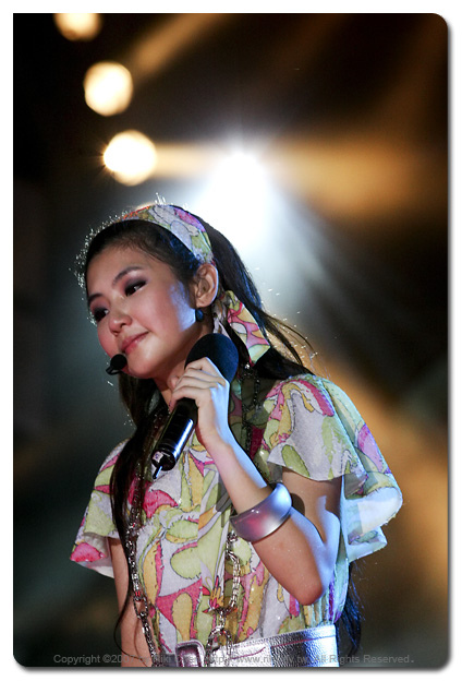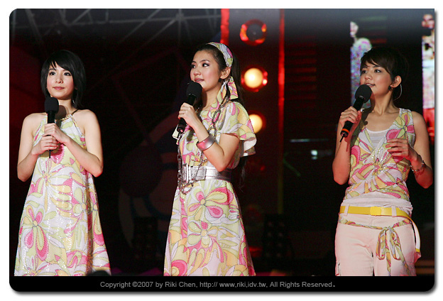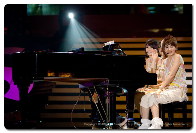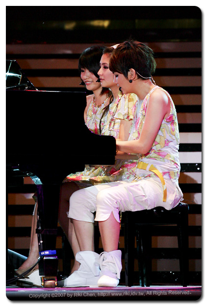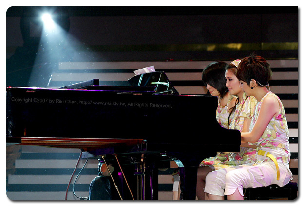 舞台上出現了一台鋼琴,S.H.E也換裝重新登場,這次不是帶來什麼熱歌勁舞,而是三人一起坐在小小的琴椅上,準備表演今天晚上重頭戲 ─「六手聯彈 老婆」。 只要是S.H.E歌迷就知道,三位仙仙的感情不是普通的好,可以說是所有團體組合的典範,甚麼要拆夥單飛的傳言都沒有發生過,也因為一路走來的好感情,才有這首「老婆」的誕生。如果假手他人完成這首歌,那就遜了... 這可是Selina填詞、Ella譜曲的一首歌,對三人的意義非凡,每次只要唱這首歌曲,一定有個人淚流滿面,這次在漁人碼頭就輪到公主Selina淚光閃閃囉。 感謝一堆攝影大哥衝上前去拍六手聯彈,現場攝影記者位置大搬風,我才能搶到中間的位置,拍一些「正面」的照片,不過也到了最後一首歌,來吧~ 讓我捕捉一些S.H.E舞台的「魔力」吧! 快樂的時光很快就到了尾聲,三人搭乘升降梯在安可聲中離開,歌迷不死心的狂喊希望換回三人,不過HEBE小姐說了聲:「...沒有安可啦,趕緊回家喔,乖!」。這句話才剛講完,雨神似乎知道換他表演了,傾盆大雨隨即落下,神奇的演唱會就此劃下句點。 太神了~~~~~ (全文完) |