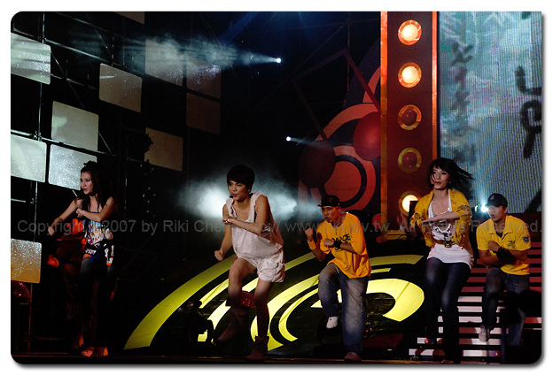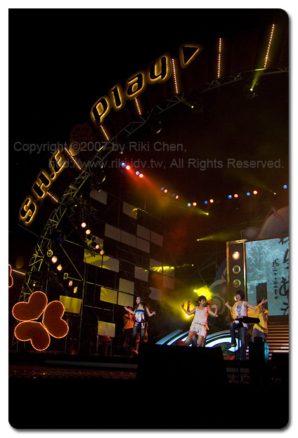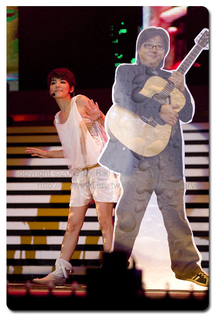 在演唱會中為了讓藝人更衣,通常會安排一個VCR橋段,製造一個換衣服空檔,本場演唱會當然不例外,只不過很kuso的搞了三個女生,穿S.H.E在MV中的招牌粉紅太極裝,把『中國話』這首歌破壞殆盡,讓現場歌迷在笑鬧中期待正版『中國話』登場。只有S.H.E能取代S.H.E,這首『中國話』當然只有三位原唱最能抓到精隨,比起kuso MV中的口齒不清三人組好多囉...,精確的舞蹈動作加上dancers的配合,畫面看起來就是好看!至於自油時報還管不管中國話?很明顯是個政治議題操作,這件事情早就被遺忘了~~ 勁歌熱舞後就是端出勵志小品─「聽袁惟仁談吉他」,很特殊的安排是"分開"了S.H.E,負責Rap部分的Ella站前方,Hebe與Selina到舞台後方擔任合音天使,一起訴說小胖老師鄰居的創作故事。可惜今天的演出沒有特別來賓,不然小胖老師出場的效果一定很好,唱片公司只請來袁惟仁分身站台。後面的觀眾朋友可能看不清楚,這可愛的分身由於下午被雨水淋到,不幸發生病變,身上冒出碗公大小的水泡,算是本場演唱會中唯一壯烈成仁的烈士。 (未完待續) |