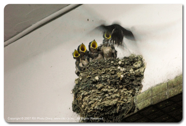 上一篇的飲料炫燿純粹是臨時起意的小品文,本篇才是正題... 當正常上班族以後,還是保持著隨身攜帶相機的好習慣,只不過從DSLR降到G7,雖然還是很大台的隨身機,不過為了畫質還是得妥協它的size。(也沒有大到誇張,只是口袋裝不下) 吃晚餐的途中無意發現騎樓樑上有燕子巢,而且還有即將長大離巢的小燕,這時候不把相機拿出來就對不起媽祖跟上帝。拍了幾張後就想等餵食的畫面,像個笨蛋再騎樓下與小燕子大眼瞪小眼,幾輪的失敗後就發現成鳥接近前,幼鳥就會張嘴,運氣不錯就捕捉到正在餵食的精采畫面。 燕子父母真是辛苦,小燕子都長那麼魁武,不知道要吃幾隻蟲才會飽,就看成鳥不停的來回飛,努力餵飽那一張如無底洞的小黃嘴,真的感嘆父母難為喔。 拍完了鳥吃飯的照片,換我去吃飯了... ﹝後記﹞晚上傳照片給JOE分享,他老兄第一句話就說:「哇,鳥類生態攝影耶」,言談中頗有嘉獎之意,不過我義正辭嚴的回他一句,「這不是生態攝影,是親情紀錄啊!」... 有沒有很有FU? 每日一句唷 ^^ |