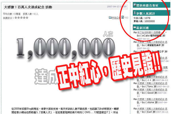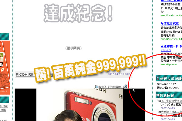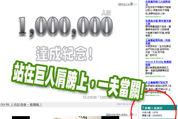 從2005年初寫Blog到現在,承蒙大家的支持,每天來訪的人數不斷成長,也認識了許多新朋友。轉眼間這個小網站也即將邁入「百萬人次」,在這個里程碑的偉大時刻﹝OMG.... 13號星期五!?﹞,本站也不免俗地舉辦小活動慶祝,徵求網友們提供「999,999」、「1,000,000」與「1,000,001」三張螢幕擷取圖,給小弟做個紀念。 至於獎品呢?那就贈送五月份出版的Digiphoto雜誌一本作為小小賀禮 ^^ (禮輕情義重啦!),如果有參加者發生畫面重複的現象,那就以網站上留言先後作為領獎依據。 最後還是呼籲一下,本篇請大家踴躍留言,別再潛水囉~~ |
