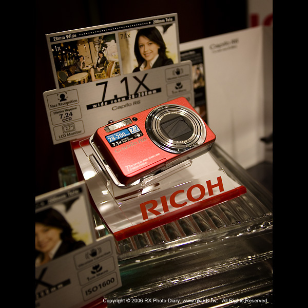 熟悉的網友都知道RX是Canon的死忠,不管單眼、消費型傻瓜,一律只考慮Canon 系列產品,可是今天要討論的卻是另一個品牌的相機 ─ RICOH R6!為何有樣大的轉變呢?其實是有人告訴我今天記者會有抽獎,現場會送出一台R6相機,那抽個空去關心一下數位影像界的發展,突然就變得很重要了。 記者會當然圍繞在RICOH相機有多好這個老梗上...,不過現場的噱頭是請來旅遊生活頻道「瘋台灣」節目主持人Janet,在台上演出一段短劇來告訴大家R6是一台最適合旅遊的相機。仔細看看這台相機的規格,28-200mm的焦段真的很棒,絕大部分的生活旅遊狀況都可以應付,想想我的PowerShot G7缺點就是廣角不夠廣,遺憾啊 遺憾...,不過R6的光圈與其他規格就遜了一級了,畢竟消費機與準專業機的訴求還是不同,不能拿來相比較的。 如果你問我推不推薦?其實我挺看好這台相機﹝不然也不會跑一趟記者會﹞,撇除它的規格不說,光公司貨一萬三千元的價格就沒話說了,絕對是物超所值的一台機器,尤其R6的紅色款~ 拿在手上挺騷包超心動的。如果讀者們想要買相機當禮物,可以考慮這台紅色的R6,絕對讓您有面子! |