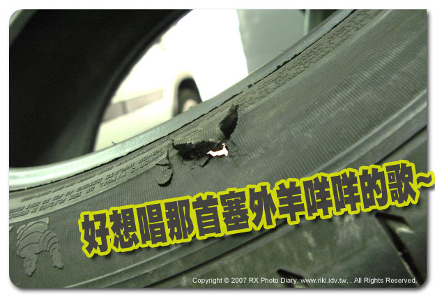 等到星期一輪胎行上班才能拯救愛車,一看到輪胎側邊破洞就知道沒救囉,換上從沒登場的備胎來去換吧.... 反正半台Wii就這樣不見了~ 星期天爆胎以來,就有一首歌在我腦海盤旋,就是那首充滿塞外風情、趕著羚羊跑來跑去,還有草枝搖擺的傳統民謠,聽起來特別能夠安慰我受傷的心,有興趣的讀者自己去找吧..........XD |