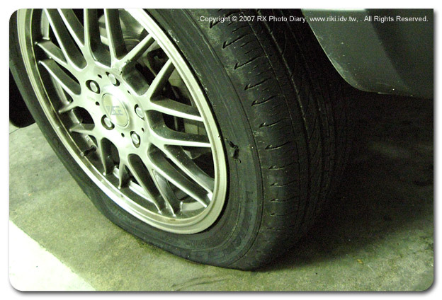 星期天早上開車出門,剛拐個彎進入社區的主要出入口,就遇上「技術大考驗」,窄窄的巷子邊停了一台休旅車,逼得我不得不往右邊靠,然後往前開就突然聽到一聲巨響,以為撞到甚麼東西,可是車速這麼低... 下車一看,原來是爆胎了.... 真是超級不爽,愉快的星期天早晨心情全給破壞了,能怎麼辦?只好倒車回停車場了... 星期一再叫人來修理,花錢消災不然怎辦?可惜我們不能拿噴漆幫這幾台車塗鴉裝飾一下,拿個相機拍下來公佈一下,讓各位看倌評論一下,是非公道到底在哪理? |