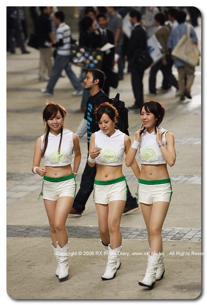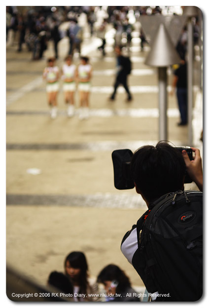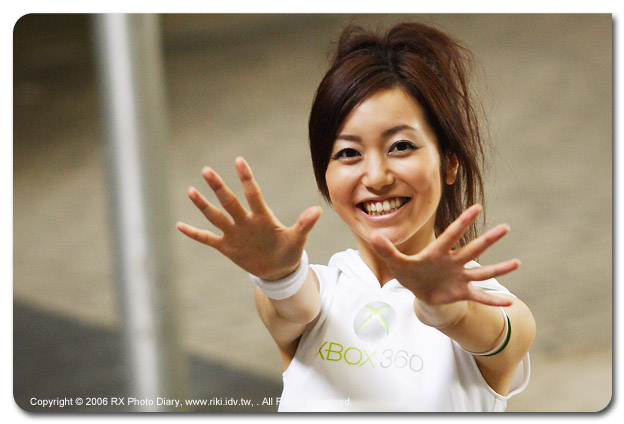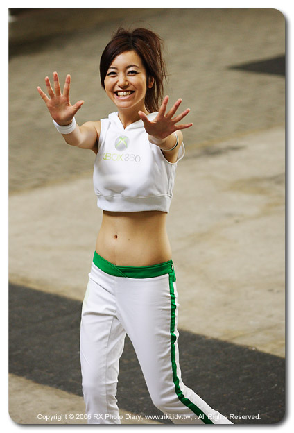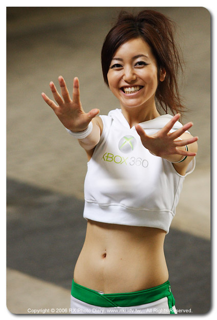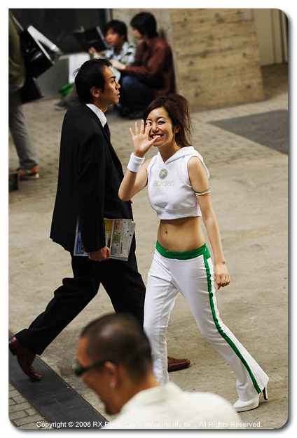 這次的秀展除了移師到日本外,SG清一色改成東洋妹究竟還有甚麼不一樣的地方?其實是我膝蓋受傷只好了大概八成,有點勉強的在秀場巡狩,一段時間就必須要找地方休息... 這時候兩個展館之間的中庭樓梯上就是最棒的殘障休息區。 坐下來喝口水也冰敷一下膝蓋,雖然已經減輕重量只帶一機兩鏡,在體能非常時期還是很重的負擔,在電玩展中坐在台階感覺自己好像是RO裡面的弓箭手,龜在地上等待體力值回復....。等啊等,在致高點上怎看到一群又一群的XBOX 360 SG出現,推測應該是交班時間~ 這時候當然要拿起相機捕捉我最愛的次世代主機美麗代言人的倩影。 這群360 Girls中有一個落單的,拍攝過程中她似乎注意到我,相機大台加上白色鏡頭明顯,想偷拍是不太可能的,本來以為她會生氣給個白眼,不過她卻露出客氣的微笑,很大方地擺了Pose讓我儘情拍照,只有短短的幾步時間,大家各司其職互相留下這個會場應該會出現的畫面,然後揮手道別。 沒機會向她道謝~ 只能在Blog上說一聲 Thank You! |