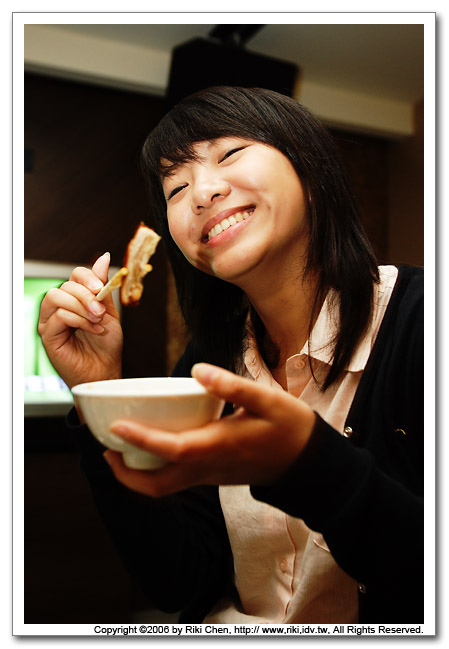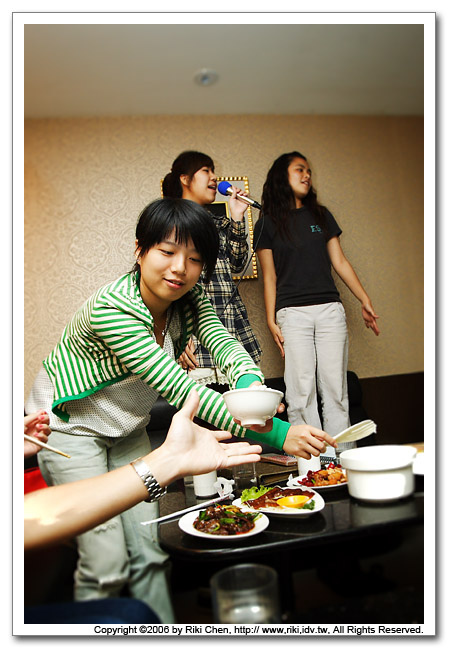 很快地,桌上所有能吃的東西都掃完了,包含一大鍋的白飯,別小看這群號稱「153俱樂部」的少女們,白飯可是一碗再一碗... 即使沒菜還是要再拼一碗~ 雖然照片很多,可是不要以為吃很久喔... 當我專心看著電腦螢幕點歌的時候,回首盤中只見辣椒與裝飾菜葉。 飯吃完了... 這群蝗蟲就開始進攻點歌機,螢幕上先是被歌曲名稱塞滿,然後「下一頁」、「下一頁」直到點歌上限為止。 壓力過後的宣洩能量真的很可怕,這群少女們鞋子一脫就在沙發上狂跳,氣氛越來越High,唱慢歌都被噓﹝還敢cut掉老師等好久的歌曲﹞...從「飛向妳飛向我」一直飆到「轉吧七彩霓虹燈」。 唱到凌晨收工回家,別以為就可以輕鬆就寢,同學們還是繼續挑燈為了作業奮鬥,加油囉! |
