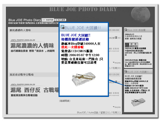 多年前JOE許下了一個心願,只要這個願望達成,他願意當一日義工作社會服務,而2006年他達成心願了,星期天就是履行諾言的時刻。 JOE今天提供的是免費協助有緣人清洗數位相機感光元件服務﹝CCD or CMOS﹞,在他的網站上有公佈消息,只要有人拿相機來要求協助,本著結緣心他一概不拒絕地仔細服務,為現場來賓去除感光元件上的灰塵。不要小看大師的誠意,光手上這把小刷子,可是超級無敵的「正離子刷」,一根要價3000大洋...。很嚇人對吧?JOE大師很輕鬆的表示,既然要做公益,那就要做到底,這樣才符合他的「完美」原則。 看著大師不計成本為民眾清理相機,身為大師好友的我,一定要將此義行紀錄下來,雖然JOE強調做人要低調,這樣的好人還是值得大家給他鼓勵的。 |