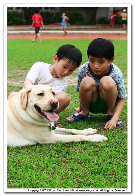 沒課的下午,本想帶布丁到學校大草地晃晃~,因為狗對綠色有莫名的狂愛,與政治無關、不需要巴結~ 很義正嚴詞的說:狗~ 就是愛綠色。 出發時候突然想到,幹麻大費周章開車跑那樣遠啊,宿舍後面的小學的草地+操場就夠大囉。哇哈哈哈~ 馬上省了一筆汽油錢, 也圓了布丁的草原狂奔夢。 跑了幾圈之後,來了一群小朋友,看到布丁就很興奮的跑上來,大聲呼喊「哇塞、黃金獵犬耶~」... 顯然的國民教育沒有做好,連拉布拉多狗都不認識...。為了國家未來主人翁,我馬上發揮老師的天性,當場給小朋友上了一堂課... 「小朋友,這叫做拉布拉多犬喔~」 「拉布拉多犬是狗狗裡面最聰明的一種喔...」 「黃金獵犬不好,你看它們拉屎會黏到毛上面,好髒耶...」 「拉布拉多犬很難養喔,主人一定要是帥哥或美女,不然狗狗會離家出走...」 就這樣,RX老師為這幾位幸運的小朋友上了一課,導正他們關於狗狗的觀念,不要因為觀念偏差影響到未來人格發展。看到這裡,相信讀者們一定被這種無私的精神深深打動~,真是太佩服我自己了~ 哈哈哈!!! |