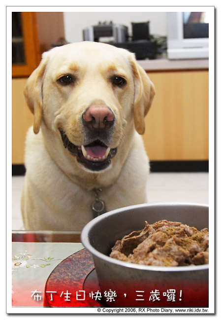轉眼間,布丁在我身邊已經要正式邁入第三年囉,雖然每天都要幫你擦屁屁... 還是要感謝你讓我生活增加了許多樂趣。 今天又是辛苦的星期四,飛車將近300公里從雲林回到台北,坐在後座的布丁一點也不疲倦﹝廢話﹞,開車的狗爸爸可是快累癱了... 不過今天是大爺三歲大壽,還是得打起精神幫布丁準備一頓豐盛的晚餐。 今天主菜可是豪華「美國去骨牛小排」喔,相較於每天吃的乾飼料來說,已經宛如「茹絲葵」般的珍貴,好好享用吧~ 這可是老爸精心川燙的高級料理,一年就這一次,不要想太多喔!~ 生日快樂,布丁!! 要繼續健康開心過日子喔~ |