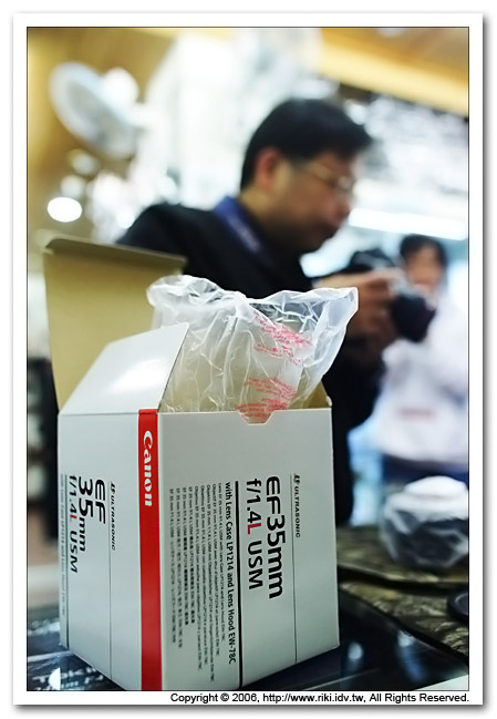 Canon鼎鼎大名一代銘鏡 - EF 35mm F1.4L USM,多少人魂縈夢牽的一顆鏡頭啊?看包裝盒後面那位隱身於散景中的仁兄,就是這顆鏡頭的新主人,真是太羨慕、太銷魂了~ |