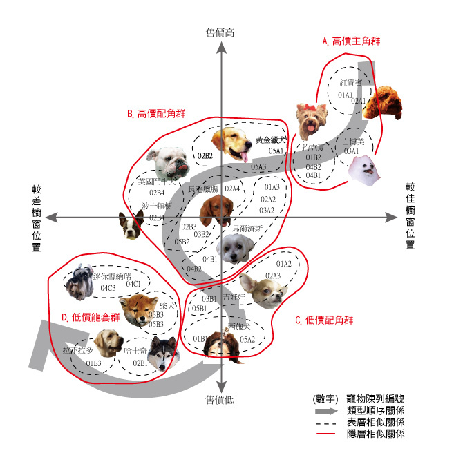 將觀察的結果圖表化後,以座標軸橫軸為櫥窗陳列位置優劣,採用貨架理論的『黃金位置』概念,以一七0公分高度的消費者而言,黃金位置應該是由地面算起七十五至一二五公分之間;直軸為犬種售價高低,依照網路上所標示的參考價格為準。14種犬種類型的空間配置與指標圖解的關係分佈價位大多數集中落於一萬五千元及兩萬五千元之間,可得知目前寵物店主要以此價位作為店中主力商品的售價。