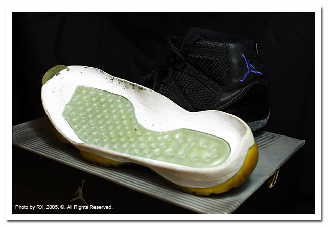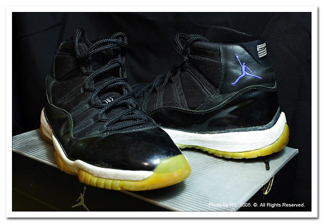穿上我的AIR JORDAN 11出發到球場,這雙球鞋可是鼎鼎大名喬丹系列11代,我買的是復刻版全黑色,鞋面上黑色發光的亮皮當時可是震驚運動鞋界,充滿炫麗的黑人風格,尤其是白黑版本最為誇張... 甫上市我還不太敢買~ 直到復刻全黑色上市我才調整心情買下去... 當初也買了三千多吧,貴死人...