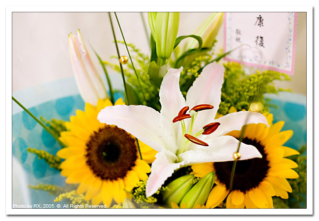 小小一間病房可以說堆滿了眾多好友的心意,其中最顯眼莫過於這束太陽百合,綻放的百合搭配花型如太陽的向日葵,讓沉鬱的病房充滿生氣,振奮了大師心情,跟我一起暢飲冰糖燕窩、享受沁涼水梨,八卦四方樂融融