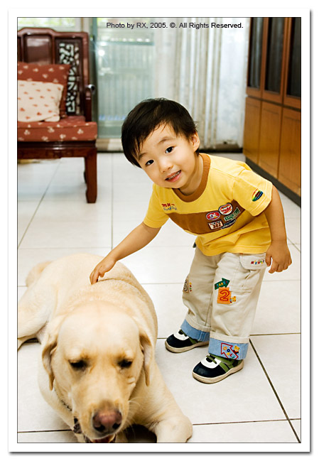 小孩子的成長變化真是驚人,兩個月前對於布丁一點都不懼怕,現在見到大自己一號的巨犬,似乎感受到一點壓力,從「勇者無懼」變成「小心翼翼」,看在這個舅舅眼中,金太郎每一個改變的小動作都是那樣可愛~~
