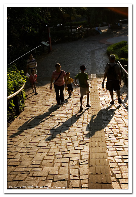 夕陽下,一對父子與母女交會而過,留下這張四人三影有趣的畫面。每個孩童幼小時都需要兒童樂園的慰藉,拜託一下管理單位把這個夢幻園地整理一下,你們的工作是幫小孩編織夢想、製造歡樂....不是當個公務員...