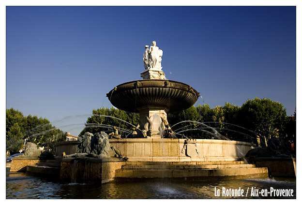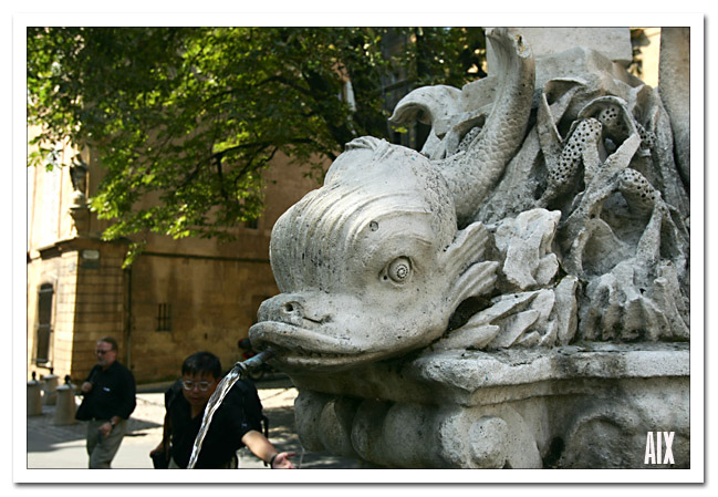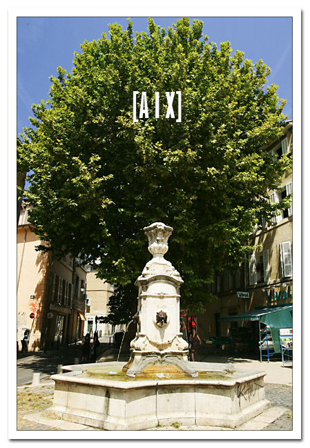 雖然我們很順利來到AIX,當要尋找旅館時發覺這城市環城道路竟然是單向道的設計,我們這兩個謹慎的觀光客,每當錯過出口或發覺走錯路時,都是以回到明信片上的林蔭大道頂端的圓亭噴水池最為定位點。很美麗的噴水池,不是嗎?上面的三尊雕像分別代表著司法、農業、還有精緻藝術喔!!