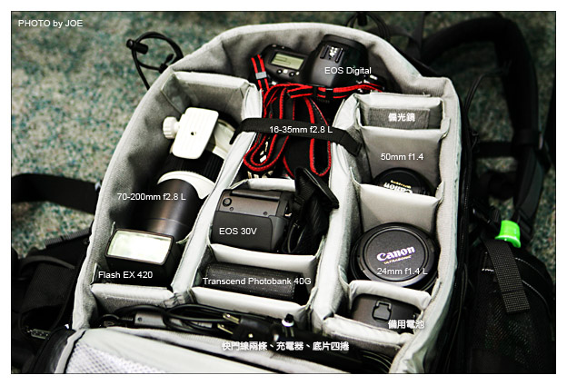 這是本次出國攝影包包裡面的東西,除了腳架隨行李託運外,其他東西怕行李寄丟所以上飛機連充電器都得塞進包包內當隨身行李。抵達開始工作時候,只少了行動碟與充電器,其他東西還是隨身扛著,不管是在薰衣草田中還是白朗峰上。
