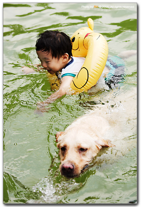 離開泳池稍作休息,沒體力的布丁趴在地上喘氣,活力仍十足的金太郎又跑去騎在布丁身上。拉布拉多真的是小朋友的最佳良伴,布丁一點怨言也沒有,這幅情景真的像是小時候海王子卡通,帥氣的小王子騎著白色海豚在七海遨遊,呵呵,長大再給你看照片囉。