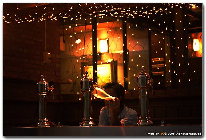 岸堤旁開了好多有特色的小酒吧,這應該是淡水目前的特色之ㄧ,氣氛的燈光加上音樂,慵懶的酒保與啤酒氣泡,這是都市緊張氣氛壓力下的最佳解藥,淡水夜色中的酒吧的確給人不ㄧ樣的感覺。起碼... 也遠優於咫尺之遙的燒烤店來得有氣氛些。