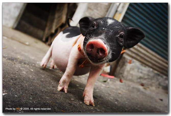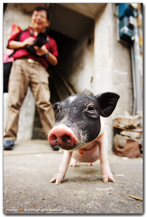 這一頭養在路邊的迷你豬挺可愛的,一堆人拿相機對著它,還跟model一樣一個一個慢慢行注目禮,讓大家都能留下他可愛身影。