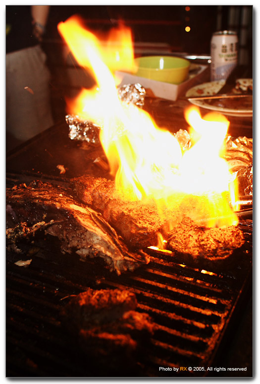 晚上八點鐘,把好料通通搬出來,準備讓膽固醇跟高蛋白進攻我的身體囉。根據B爸的說法,燒烤容易致癌,所以如果吃一片10元的甜不辣跟昂貴的牛小排都有同樣機率的話,那我們就不客氣烤些正點的東西來吃囉,所以今天的菜色有... 牛排、羊排、牛小排、大蛤仔、泰國蝦,還有秘密武器鮪魚下巴都出現了,反正都要烤好料的,這樣致癌才沒有遺憾。