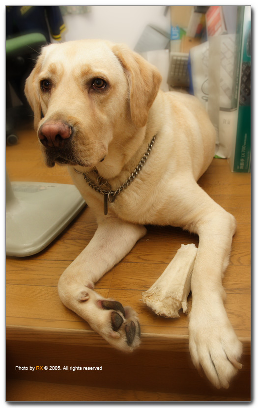 回到家在電腦桌前面整理照片,布丁總會叼著他的牛皮骨到我腳邊來作伴,龐大的身軀跟我ㄧ起擠在小小書房中,過一陣子就會傳出呼聲,雖然是個很不負責的伴讀書僮,總比他在腳邊磨蹭撞倒電腦、踩掉電線好多了。