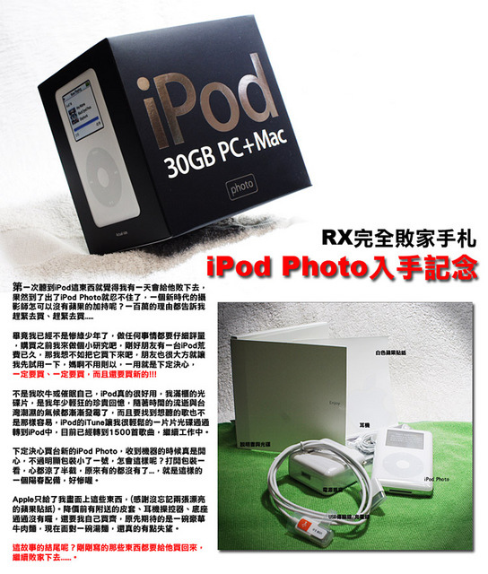 很陽春的iPod Photo,不過還是不減心中那份激動,馬上來充電,跟iTune同步塞滿它,在來嘗試一下他的相片瀏覽功能囉,這種人生真是讚喔。 Apple也真夠狠,一些"必備"的配件都要買耶... 買吧 買吧,為了台灣經濟,咬著牙拼命花錢。 http://www.apple.com.tw/store/ipodaccessories.html