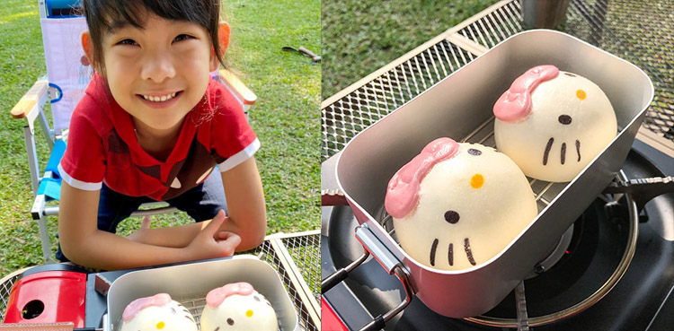 媽媽精心為彤妹準備的Kitty爆漿流沙饅頭,搭配戶外煮飯便當盒蒸饅頭