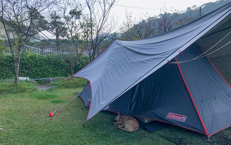 睡覺前把天幕降下來擋風禦寒,沒想到爽到是浪浪小黃