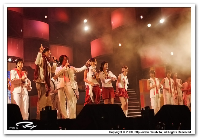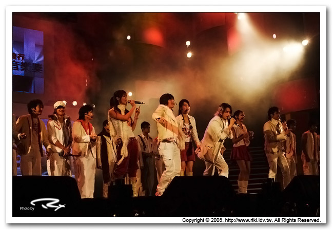 | 活動不囉唆在主持人簡短開場後馬上展開,由喬傑立全公司8組歌手拉開序幕,包括5566、183Club、K one、台風、七朵花、太極、VJ、茼蒿LALA隊等8大天團全體總動員,總共30人的超大型演出。〔當然他們唱啥我搞不太懂,因為那時候努力熟悉Sigma 120-300mm F2.8中...〕 |