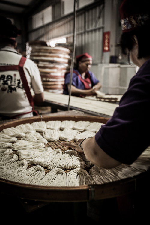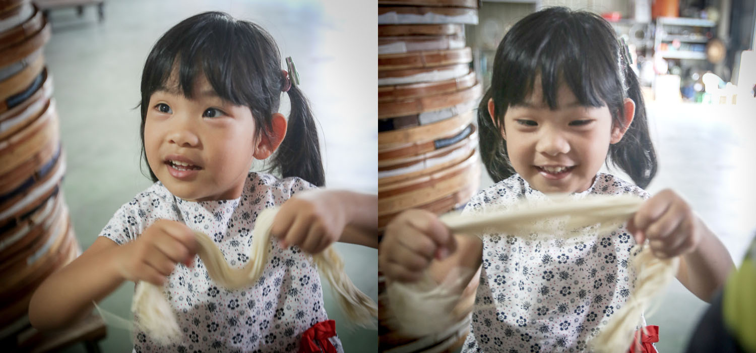 合進關廟廟/ 合進製麵廠 @ 台南市關廟區仁愛路583號吃了將近10年的娘家關廟麵,只知道哪裡買實在很遜... 關廟麵好吃與馳名的關鍵到底在哪裡?我想吃再多碗麵也沒有用,直接走一趟工廠就知道答案了。熱的半死的天氣拜訪「合進關廟麵」真不是件輕鬆事,頂著大太陽進入曬麵區答案就躍出,用陽光曬的麵就是比烘乾室的好吃,同樣的道理在「將太的壽司」對米的烘乾影響口感也有同樣的描述,太陽除了是Superman的能量來源,也影響到食物的美味程度啊。"日曬"VS"機器烘乾"在口味上當然是日曬大勝,要曬完27小時才算完成,-而且曬幾小時後還得進屋冷卻「回溫」,這樣麵條才會扎實... 但機器烘乾的價格卻是打得堅持傳統的日曬麵哀哀叫,這家製麵廠當初靠成為保力達B廣告場景才被重視,再加上產品不斷開發以及觀光工廠的推廣才慢慢復甦。